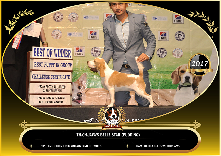 Name : TH.CH.JAVA'S BELLE STAR "PUDDING" Sex : FeMale Champion In Year : 2017 Status : at Javabeagle Kennel Sire : AM.TH.CH.MILROC MAITAI'S LAND OF SMILE Dam : TH.CH.ANGEL'S WILD DREAMS Breeder : Javabeagle Kennel Owner :Javabeagle Kennel |